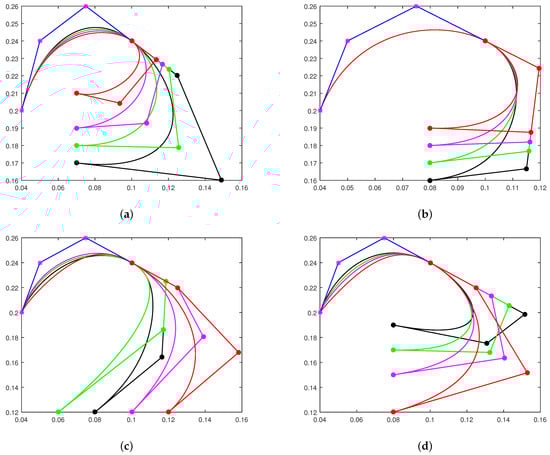 continuity of the C-Bézier curve by multi-valued shape parameters. (a) (,,), (,,), (,,), (,,): (,,), (,,), (,,), (,,); (b) (,,), (,,), (,,), (,,): (,,), (,,), (,,), (,,); (c) (,,), (,,), (,,), (,,): (,,), (,,), (,,), (,,); (d) (,,), (,,), (,,), (,,): (,,), (,,), (,,), (,,).
