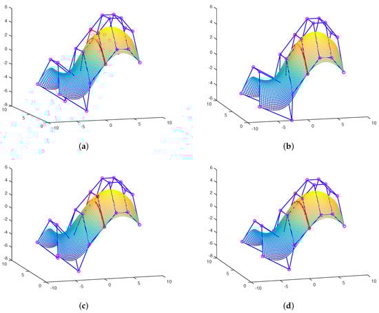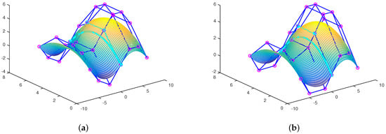 - For any value of , and by having multiple shape control parameter values, Equation (20) can be used to calculate the second row of control mesh points to meet the continuity requirement. The remaining control mesh points can be taken according to the designer’s choice.