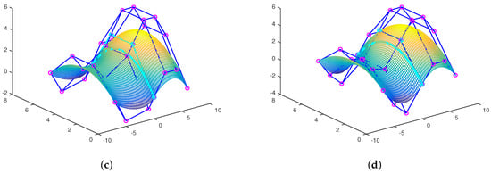 Figure 7 represents the continuity between two adjacent C-Bézier surfaces. These four figures can be obtained by varying the values of shape control parameters in their domain, and are mentioned under each figure (where ). The first 12 control mesh points can be obtained by using Equation (23), and the remaining four control mesh points can be taken according to the designer’s choice.
