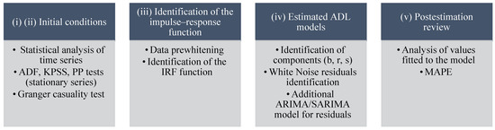 - Estimation of ADL models: in this step, the components will be fit to find the best estimable model according to the IRF information, looking for the white noise process in residuals, and if not, the theory of [11,12] suggest to create an additional ARIMA or SARIMA model on the residuals to fit the pure white noise.