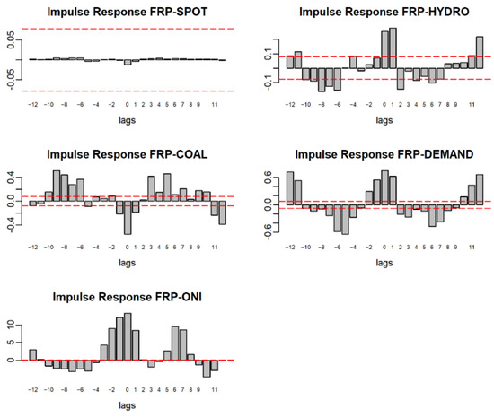 According to Table 4, Using the evaluation results of Section 3.2 and Section 3.3, the pre-whitened models, and from Equation (3), standard deviations and work as input for the impulse response function plots, with ARIMA components not greater than two information lags for both autoregressions and moving averages evaluated in a p-value for 5% individual significance. This behavior is usual in commodities with some degree of storability [24]. Regarding the GAS and SUMTHERM series, they only exist when there is a risk of shortage of the main variables (e.g., hydropower or coal power generation). In addition, those variables are not helpful to identify the FRP risk valuation in situ. Both differentiated series show a white noise effect that does not enable making progress in the ADL construction methodology ruling out.