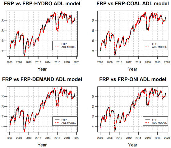 The MAPE values for each model were below 10%, showing an adjusted projection with soft noise residuals according to the criteria considered [22]. The estimated ADL models can be rewritten in equation form (Table 6).