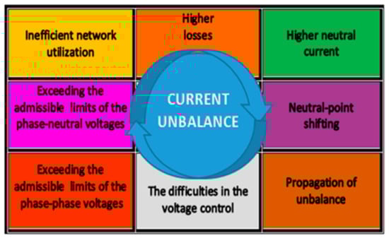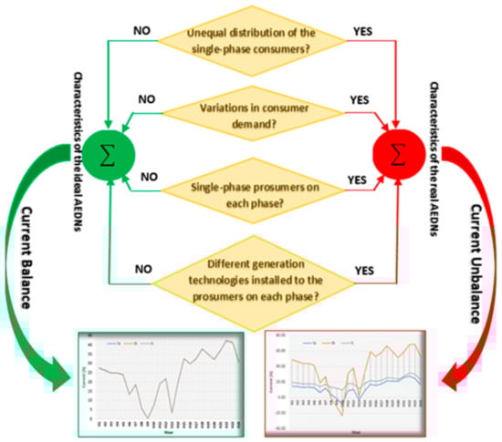 The AEDNs integrate a high number of 1-P consumers, with a dynamic variation of the demand, and 1-P prosumers with different generation technologies, connected to the three phases, so that the phase currents are no longer equal, leading to current unbalance. Their effects can conduct to the inefficient network utilization, higher losses, higher neutral current, exceeding the allowable limits of the phase-neutral and phase-phase voltages, or difficulties in the voltage control.