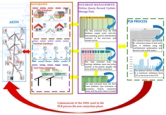 All required information in the PLB process is uploaded from three databases available at the level of the DNO (Topology Database, SMS Database, and End-Users Database). These refer to the topology, identified through the technical and location characteristics of the main elements (poles and conductors) associated with the analysed AEDN, the current profiles of the end-users provided by smart meters identified through the identification numbers, and the end-users regarding the type (consumer or prosumer), the connection phase, and where the pole is located.