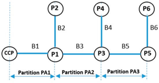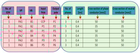 The topology of the AEDN must be recognized quickly, such that the PLB process takes place in real-time. The proposed methodology used the algorithm proposed in [] based on two vectors which participate in recognizing the topology: the first vector, [VP], having as elements the number of sections from each partition of the AEDN, and a second vector, [VB], containing the name of sections belonging to each partition placed in ascending order. As an example, the topology sequence of the proposed methodology containing details on the recognition process associated with an AEDN with seven poles, including the one on which the EDS is mounted (representing the CCP), and six sections, see Figure 5, based on the vectors [VP] and [VB], to which is added the information from the DNO’s database regarding the length, number of the phases, and the cross-section of the conductors (phase and neutral). Figure 6 contains the topology sequence attached to the AEDN with seven poles.
