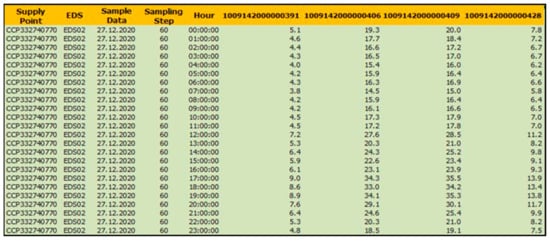 The second stage targets establishing the linkage with the database of the DNO attached to the SMS that contains the information regarding the values of the absorbed/injected currents by the consumers and prosumers. Figure 7 presents, as an example, a data sequence uploaded from the SMS database containing the following fields: Supply Point (associated with the identification number of the smart meter installed in the EDS), EDS (the name of the electric distribution substation which supplies the AEDN), Sample Data (the period queried by the decision maker), Sampling Step (15, 30, or 60 min), Hour (the time of data recording), “1009142000000391” (the identification number of the smart meter installed at an end-user).
