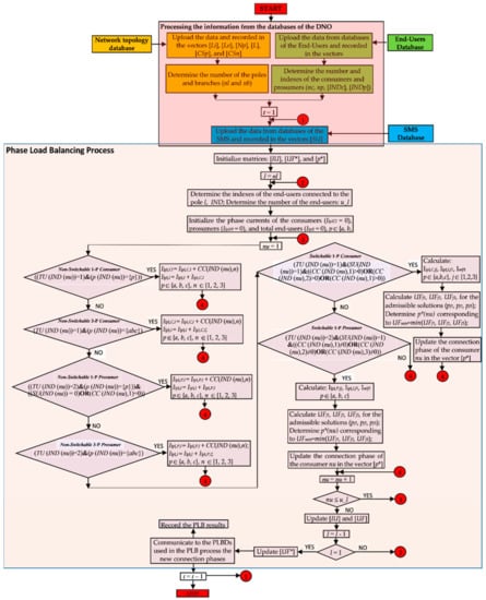 The proposed methodology allows the coordinated control of the switching devices installed to all 1-P end-users connected to three-phase four-wire AEDN to perform a fast PLB process. It always leads to the best PLB solutions considering the availability or temporary unavailability of the SSDs and the participation degree of the end-users, according to the value of absorbed/injected current (equal or different to 0). Figure 4 presents the flowchart associated with the proposed methodology.