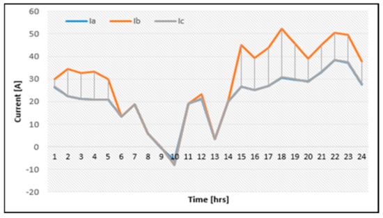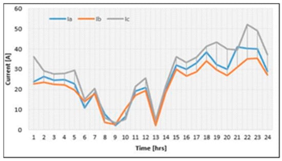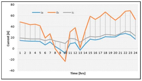 As presented, the AEDNs integrate a high number of 1-P consumers, with a dynamic variation of the demand, and 1-P prosumers with different generation technologies, connected to the three phases, so that the phase currents are no longer equal, leading to an unbalance, see Figure 1.
