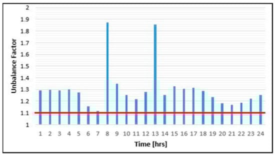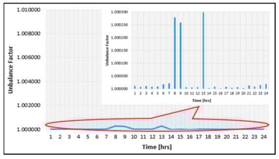 The other two PLB cases (frequently encountered in the EDNs), applied to the consumer-level (PLB-C) and prosumer-level (PLB-P), have been analysed and compared with the H-PLB case, see Figure 17. An analysis of the results led to the following observations regarding the hourly values of the UF. In the P-PLB procedure, two-time intervals, H1–H5 and H15–H24, have been identified, where the UF had the higher average values (1.037 and 1.04, respectively). Additionally, a small average value of 1.008 has been obtained in the time interval H6–H14. In the C-PLB procedure, the results were the opposite. The UF had the higher values in the time interval H6–H14 (1.041) and smaller values (1.02 and 1.017) in the other two intervals (H1–H5 and H15–H24).