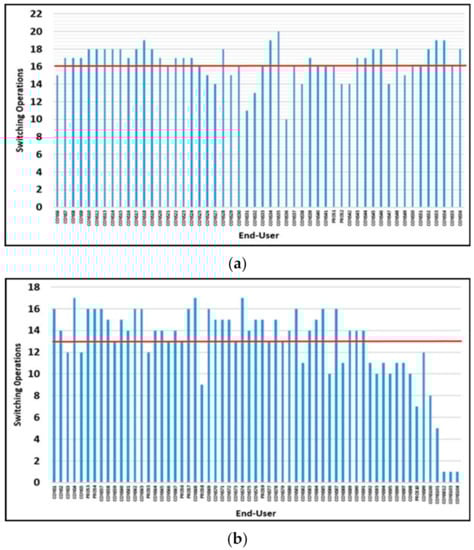 In recent years, the increase in the small-scale local renewable generation sources has led to a new electricity supply infrastructure. According to this innovative concept, the electricity generation is achieved through small-size power units located near consumers or even through consumers themselves (prosumers) and connected to the network, witnessing a transition from traditional passive networks to AEDNs. The PLB is a significant technical problem that must be solved by the DNOs, representing, also, a necessity to operate the AEDNs optimally. Most of the approaches presented in the literature in the last years use classical consumer-level balancing. The representative solutions based on the phase-swapping devices are proposed in [,,,]. Liu et al. proposed in [] a method to control phase-reconfiguration devices based on their measurable data and controller. Another PLB system connected to the three phases of the network is proposed in [], containing hardware with a micro-controller and fast switching relays. A discrete genetic algorithm has been proposed in [] to distribute customers on the phases of the EDNs, taking into account the assumption that DSO has a limitation for the PLB process. Grigoras et al. presented in [] a bi-level methodology to solve the PLB problem based on a clustering-based selection criterion of the consumers to optimal placement of the switching devices.