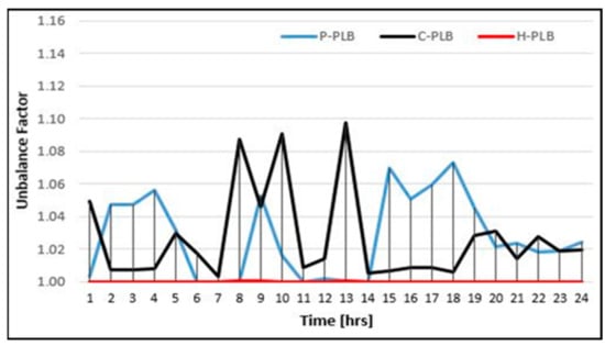 Table 8 and Figure 21 present a comparison between the PLB algorithm considering the average value of the unbalance factor (UFav), the energy losses (ΔW), and energy-saving (ESPLB). The highest benefits have been recorded using the proposed H-PLB algorithm quantified through an energy-saving of 12.64 kWh in an analysed interval (24 h), representing 58.73% of the energy losses calculated in the initial situation (without PLB). The value is higher than the C-PLB algorithm by 6.91%, and by 14.03% compared with the P-PLB algorithm. Table 9 contains details on the hourly total power losses calculated for all analysed cases.