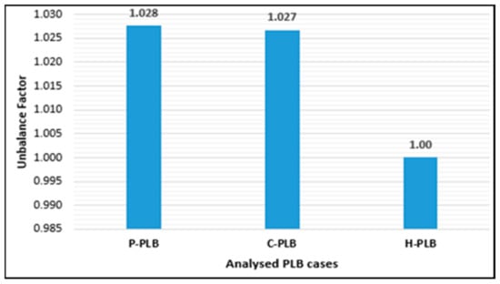 Figure 18 shows the average value of the UF in the three analysed PLB cases. The P-PLB and C-PLB cases recorded similar values of the UF (1.028 vs. 1.027), which were higher than in the H-PLB. However, they were below 1.1 (target imposed by the DNO) with approximately 0.07, emphasizing the effectiveness of the proposed PLB algorithm in these two extreme cases. These positive effects were reflected on the values of the phase currents at the level of the CCP.