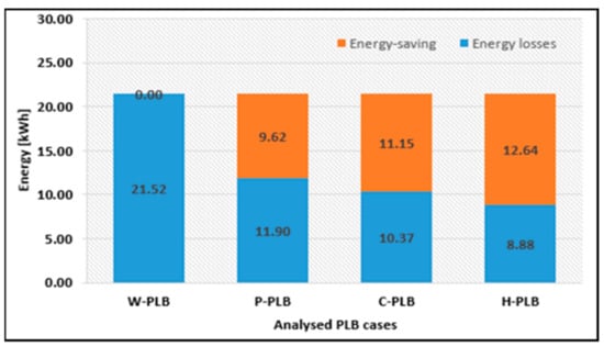 where ΔWPLB represents the energy losses calculated after the application of the PLB algorithm for the cases P-PLB, C-PLB, and H-PLB, and ΔWW-PLB relates to the energy losses calculated for the initial situation, without PLB (W-PLB).