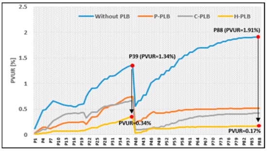 The highest decrease in the PVUR has been obtained in the case of the H-PLB algorithm. The PUVR has been improved from 1.34% to 0.34%, and from 1.91% to 0.17%, respectively, at the level of the end poles, P39 and P88.