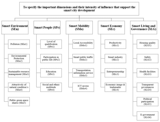 This part of the application starts with the identification of 23 criteria impacting SCD in the context of developing countries. These criteria are extracted from the literature review and other available documents about smart cities [82] as shown in Table 5. The 23 identified criteria are broadly categorized under five principal dimensions, including smart environment (SEn), smart people (SPe), smart mobility (Transportation and ICT) (SMo), smart economy (SEc), and smart living and governance (SLG) through experts’ inputs. Figure 2 shows the grouping of smart city dimensions/criteria (five principal dimensions and 23 criteria) to calculate their priorities (weights) via IF-AHP. The essential foundation for grouping is meaningful correlations between the dimensions/criteria.