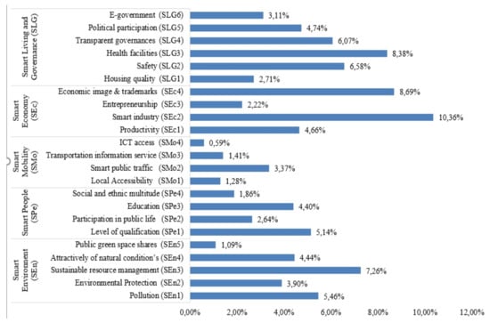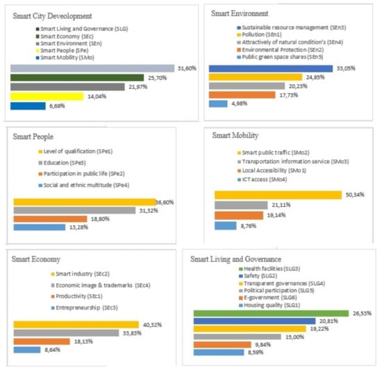 The weight values (%) of the smart city dimensions.