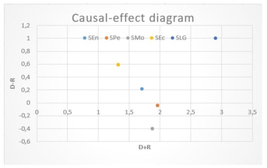 The and values are calculated using Equations (12) and (14) as shown in Table 8. The addition of rows and columns of the total relation matrix makes vectors D and R, respectively. A dimension is considered as a member of the cause division if () is positive, and in the case of its negative value, the dimension is attributed to the effect division. () that is the horizontal axis vector named ‘prominence’ presents the importance of a dimension. Therefore, the causal diagram is represented by mapping the data set of the ( and ) as shown in Figure 5.