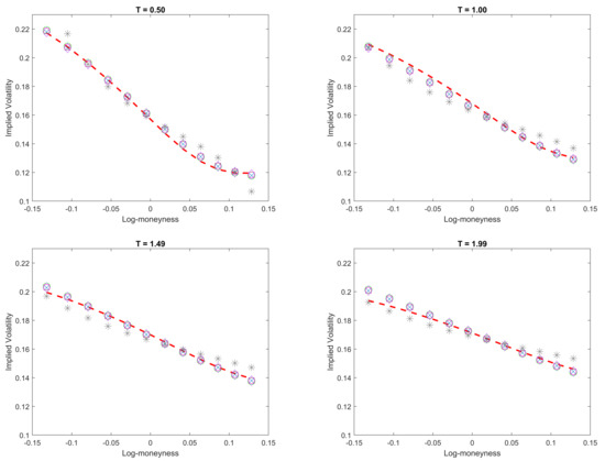 Implied volatility surface calibration on the SPX implied volatility (18 June 2021—dashed red line) for the OGPadé (diamond marker), OFPadé approximants (square, cross, circle marker), and approximation formula (asterisk marker).