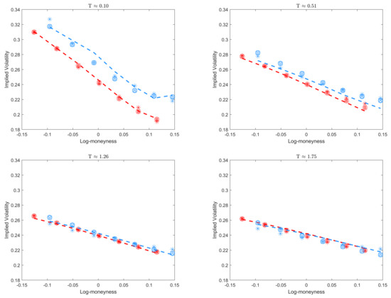 The first calibration will be carried out on an ordinary day—18 June 2021. We use the option for the top 500 companies in US market, i.e., the S&P 500 option or SPX option. Four different maturities ranging from to will be considered; the calibration of the parameters will be based on the minimization of root-mean squared error of the implied volatility. The methods GPadé, FPadé (5,4), (6,3), (7,2), and the approximation Formula (19) will be considered for the numerical experiment.