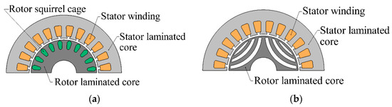 The energy efficiency of three-phase AC electric motors such as induction motors (IMs, Figure 1a), permanent magnet synchronous motors (PMSMs), and synchronous reluctance motors (SynRMs, Figure 1b) has been extensively compared in previous studies.
