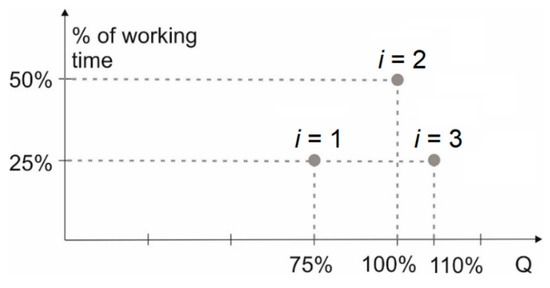 Typical pump operating conditions and flow-time diagrams are well described in the literature [38,39]. The flow-time diagram with the approximately constant flow rate given in [38,39] was selected for analysis as the most suitable for considered power range. As shown in Figure 2, it was considered: 75% flow for a quarter of the total duty cycle (below this case marked as i = 1, where i is the index of the duty cycle load point); 100% flow for half of the total duty cycle (i = 2); and 110% flow for another quarter of the total duty cycle (i = 3).