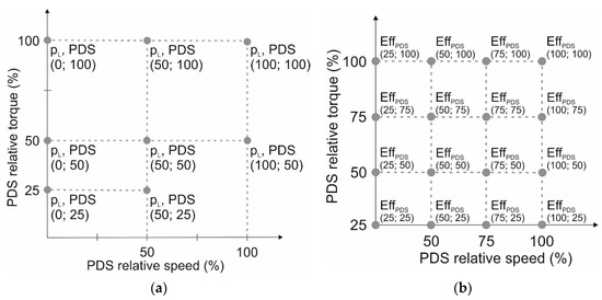 The PDS efficiency depends on the torque and rotational speed. We considered the PDS as a power drive system in terms of the standard IEC 61800-9-2: 2017 [40]. It consisted of a complete drive module (CDM) and an electric motor. The CDM included a frequency converter and protection devices. Nowadays, sensorless field-oriented control is commonly used as a method for controlling AC motors in applications that do not require high-precision control, such as pumps and fans [41]. According to [40], the PDS power loss measurement must be provided at eight loading points (Figure 3a). Values of the motor efficiency under variable speed operations and partial load conditions can be calculated, for example, according to [42], but this does not provide values for the entire PDS efficiency. Some manufacturers already provide such information; therefore, their experimental data were used for analysis as the most reliable source. Information on PDS loss at these eight points is available in the online application Sinasave [43]. Since the range of the power rating of the Siemens SynRM was limited to 45 kW, a PDS based on ABB’s SynRMs were considered for 75 and 200 kW ratings. Efficiency data for the ABB PDSs at 16 loading points (shown in Figure 3b) were provided in the manufacturer’s statements [44,45].