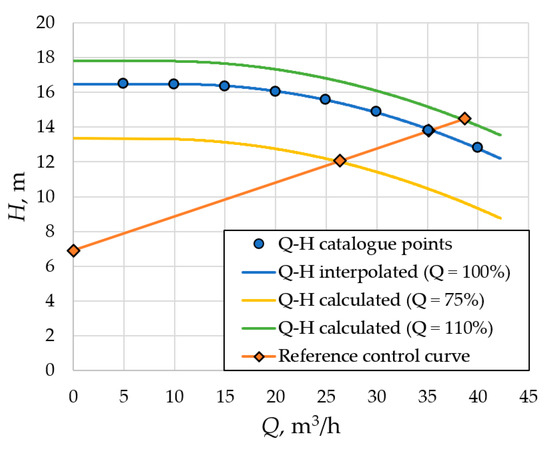 Figure 4 shows the catalogue points of the pump head-flow characteristic calculated according to Equation (2) head-flow curves and reference control curve for the 2.2 kW pump as an example. Table 4 shows the calculation results for the pump performances during the operating cycle. Table 5 shows the interpolated PDS efficiency at the pump operating points indicated in Figure 2 for the four power ratings considered.