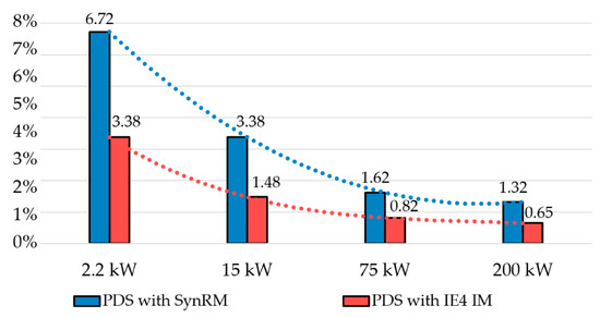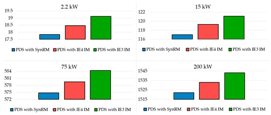 The disadvantages of SynRMs are that they have a slightly lower power factor than IMs [59], and therefore a slightly higher rated current. The current values of the considered electric motors, taken from the manufacturers’ catalogues, are shown in Table 9. The rated currents of the IE3 IM and the IE4 IM of the same power rating were approximately the same. The rated current of the IE4 SynRM was 15–33% higher than the IE3 IM, which was higher than the overcurrent limit usually provided by frequency converter manufacturers. Due to this, it is required to use a more expensive converter with a higher power rating when using a SynRM, in comparison with an IM. The cost of the converter turned out to be 10–40% higher, which led to an increase in the cost of the PDS.