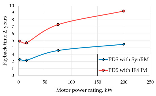 To evaluate the cost of frequency converters and IE3 class IMs, their market prices were taken from manufacturers’ websites [58,60]. It was assumed that the cost of the SynRM was the same as the cost of the IE3 IM. An analysis of recent studies [5,61,62,63] and available market prices showed that the difference in the turnkey price of motors of related energy efficiency classes was usually 15–30%. In this paper, it was assumed that the cost of the IE4 class IMs was 22.5% higher than the cost of the IE3 class IMs. Table 9 shows the assumed costs. For the considered power range, the cost of the frequency converter, as shown in Table 9, was 60–140% of the motor cost, and the difference in the price of the PDS based on SynRM and IM was in the range of −8–+5%. Based on the results in Table 9, it can be concluded that the PDSs with SynRM and IE4 IM had similar initial costs. However, despite this, the payback period of the SynRM turned out to be significantly shorter (Figure 7) due to the greater energy savings, Sy.3m.