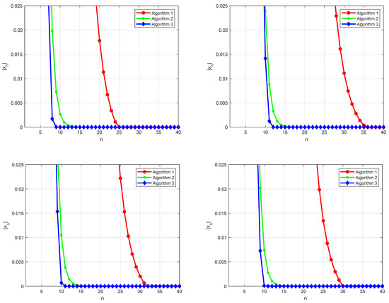 Let . Define by for all and by for all . It is easy to observe that and satisfy (A1)–(A4). By Lemma 7, it can be verified that and . Let be given by , be given by , and be given by for all . We can easily deduce that f is a -contraction, that A is a bounded linear operator, and that S is a 0-demimetric mapping. Additionally, it is not difficult to check that Let us choose , , , , and . We test Algorithms 1–3 for different values of and as follows:
