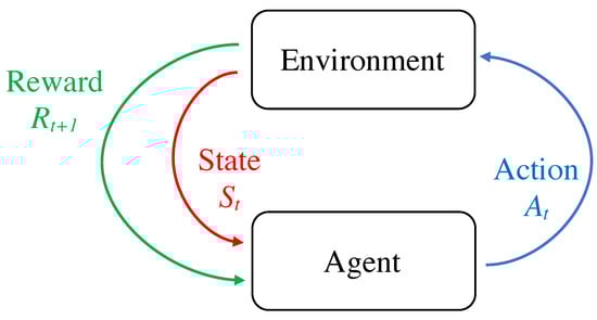 At each discrete time t, the decision-maker, referred to as the agent, observes the current state of the environment and uses this information to select the action , which then affects the next state of the environment and the reward . This process is then iterated, and a (possibly infinite) sequence of states, actions, and rewards is obtained. The environment is typically defined as everything outside the agent’s direct control. Note that the action generally does not uniquely determine : the transition matrix can be stochastic. Remarkably, the next state depends only on and and is therefore conditionally independent of past states and actions, given the current state–action. Therefore, the state transitions of an MDP meet the Markov property [12], thus warranting its name.