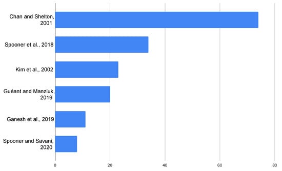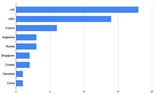The references cover the period from 2001 to 2021, with the overwhelming majority (20/23 or 87%) from 2018 onwards. They include 50 authors from 9 countries, including the U.K. (18/50 or 36%), the USA (14/50 or 28%), and France (6/50 or 12%), as depicted in Figure 3. As shown in Figure 4, old, seminal papers from the MIT AI Lab by Chan et al. [29] and Kim et al. [30] are still among the most frequently cited, with 74 and 23 citations to date. Among more modern papers, the most widely recognized seem to be [31,32,33], with 34, 20, and 11 citations, respectively. Furthermore, the paper by Spooner et al. [32] from 2018 already proved to be quite significant in the field, having influenced subsequent research [34,35,36].