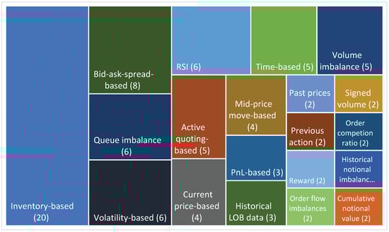 RL applications in optimal MM can be divided following any of the general taxonomies outlined in Section 2.2. Furthermore, they can be categorized according to which of the main strands of research the underlying MM model belongs. This results in three classes of approaches: (1) inventory-based, focusing on the inventory risk and rooted in the seminal paper by Ho and Stoll [37], (2) information-based, concerned primarily with the adverse selection risk and inspired by yet another seminal paper (Glostein and Milgrom [38]), and (3) model-uncertainty-based, emphasizing the model risk and centered on the paper by Cartea [39]. (The third class is particularly small. Yet, we still mention it for the sake of completeness). However, for reasons of convenience, in this paper, we adhere to a combined categorization into four categories: (1) information-based approaches, (2) approaches stemming from analytical models, (3) nondeep approaches, and (4) deep approaches. It should be emphasized that this categorization is not mutually exclusive, but is collectively exhaustive.