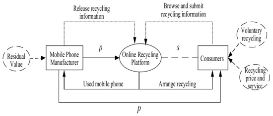 Recent years have witnessed an increase in e-waste with rapid advances in electronic products. Global E-waste Monitoring 2020 reported that 53.6 million metric tons of e-waste were generated globally in 2019 (https://news.un.org/zh/story/2020/07/1061272 (accessed on 10 October 2021)). Recycling of used mobile phones has attracted great attention of society due to the corresponding economic and environmental benefits [1,2]. With accelerated replacement of mobile phones, massive quantities of used mobile phones are recyclable. An online report estimated the scrap volume of China’s mobile phones to be 303.933 million in 2018 (https://www.boolv.com/html/news/5452.html (accessed on 10 October 2021)). Incidentally, there is an urgent need to innovate the recycling channels for used mobile phones, encourage customers to actively participate in recycling, and realize the recycling and reuse of used mobile phones [3,4]. In this context, online recycling, which combines the used mobile phone recycling business with the Internet, is developing rapidly.