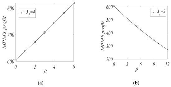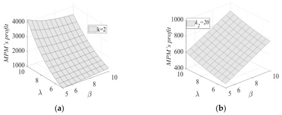 Although the above analysis shows that customers preferences of both the recycling price and recycling service have impacts on the MPM’s profit, understanding of the differences between these two types is limited. In this subsection, we conduct a comparative analysis through numerical studies. Letting , , and , we assume that , , and . Suppose the service cost coefficient satisfies and for the two cases where the service cost coefficient is small and large, respectively. We show in Figure 4 changes in the MPM’s profit under different service cost coefficients.