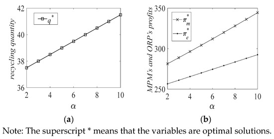 With an increase in , the customer becomes sensitive to the recycling service. To improve the recycling quantity and recycling profit, the ORP should provide a better recycling service to attract more customers. An increase in the recycling commission means that the ORP can obtain more commission income, which offsets the recycling service cost, so the recycling service will be improved. Moreover, an improvement in the recycling service can attract more customers to participate in recycling, so the MPM will reduce the recycling price to cope with the cost pressure caused by the increased recycling commission.