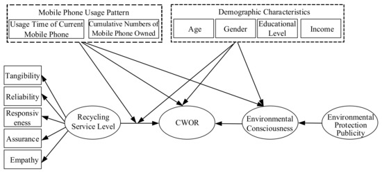 Currently, most online recycling studies focus on the manufacturer’s choice of dual recycling channels [10,11], pricing strategies for the traditional and online recycling channels [12,13], and impacts of customer preferences of the choice of the dual recycling channel and recycling pricing strategy [9,14]. Meanwhile, customers’ willingness of online recycling (CWOR) is another driver of recycling of used mobile phones [15]. From the development law of the Internet economy, customers’ involvement is crucial for the success of the online economy. Different from the forward sales channels, used mobile phone recycling is not a solid demand of customers and the frequency of recycling is limited, and it is not worthy of attracting customers through the high-price recycling strategy. To stimulate customers’ participation in recycling, the influencing factors of CWOR must be explored. Additionally, Previous studies consider customers’ recycling behavior from the perspectives of information security, service convenience, and platforms’ transaction behavior [8,16,17,18]. However, these studies did not verify the relationship between recycling service and recycling willingness.
