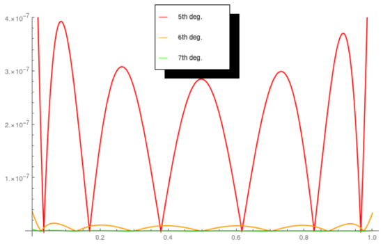 The absolute errors of the 5th, 6th and 7th degree PLSM approximations for problem (15).