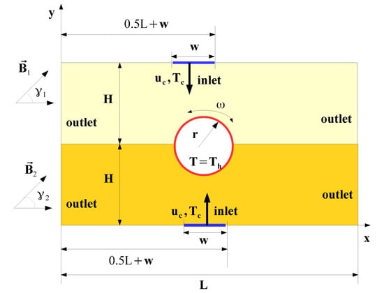 Jet impingement (j-imp) cooling performance with hybrid nanofluid (N-F) is explored for a rotating hot cylinder exposed to jets in opposite directions, as shown in Figure 1. A hot rotating cylinder (R-C) with radius r is used, with a rotational speed of . Single confined jets emerging from nozzles with width w are considered. The R-C is in the middle of the computational domain, and the upper and lower parts are exposed to uniform MaF with strengths of and . The inclinations of the MaF are denoted by and . The hot cylinder is maintained at a constant temperature of ; the cold fluid streams at temperature and velocity enter the domains. The distance of jet inlets to the interface is H, and the lengths of the upper and lower plates, which are adiabatic, is L.