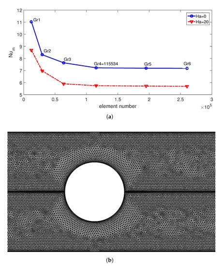Numerical simulations were checked for grid independency. Numerical tests were conducted for different grid sizes, and results are given in Figure 2a for the variations of the average Nu at two different MaF strengths of the upper domain. Grid system Gr4 with 115,534 elements was selected, and the distribution of the grid near the R-C is presented in Figure 2b.