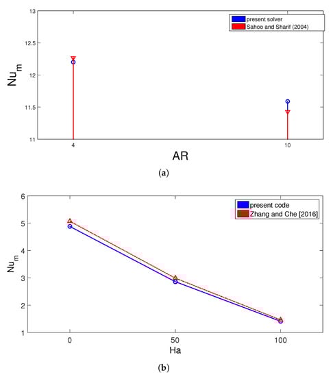 The numerical code was validated by using different studies available in the literature. In the first study, numerical results from the work of Sahoo and Sharif [] for j-imp cooling of a surface held at constant heat flux were used. Figure 3a presents the comparison results of average Nu for two different aspect ratios (AR) at Re = 500. The deviations are 0.6% and 1.3% from the reference solution at AR = 4 and AR = 10. Another validation was performed by using the confined slot j-imp cooling results available in [,]. Table 1 presents the stagnation point Nu at Re = 300. The highest deviation was 1.55%, from the results of []. Finally, the effect of using MF in convective HT was considered within a cavity by using the results of []. Comparison of average Nu for different MF strengths is shown in Figure 3b at Gr = . The highest difference was found to be below 5% when the present solver results were compared. The results showed that the present code is capable of simulating the effects of MF in convective HT and j-imp HT.