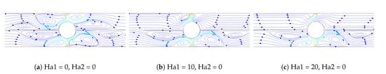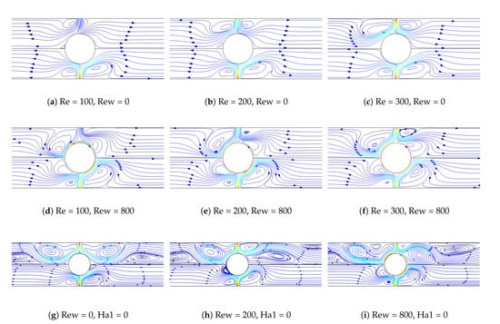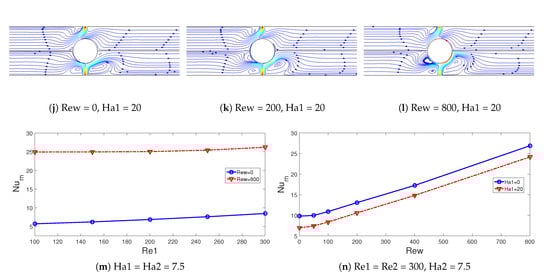 Flow patterns are shown for different Re numbers in the absence (Figure 4a–c) and presence of (Figure 4d–f) rotational surface effects. When rotations were not active, due to confinement and entrainment, vortices were established near the inlet zones. As the Re was increased, vortex size enlarged. As the rotational surface effects were considered, the vortices near the inlet region were distorted due to the rotations of the cylinder, and additional recirculation zones were observed near the hot cylinder. Effects of Rew on the flow pattern distributions in the absence and presence of MaF in the upper domain are shown in Figure 4g–l. When there were no MaF effects present, recirculation zones near the inlet and and secondary vortices at the interface on the upper part were observed. When rotations were introduced, on the top wall of the upper domain, multi-recirculation regions were established. At Rew = 800, three vortices are shown adjacent to the upper domain top wall. As the MaF was imposed at the highest strength, suppression of the vortices in the upper region is shown for all Rew. Impacts of Re on the average Nu were weaker when rotational surface effects were considered at the highest speed, as shown in Figure 4m. For the case with a motionless cylinder, the average Nu rose by about 48.5%, but this amount was only 5% when rotational surface effects were dominant. The rotations of the cylinder brought significant enhancement of the average Nu as compared to the motionless cylinder configuration in the absence and presence of MaF effects. The enhancements were 175% and 249% when rotational effects at the highest speed were compared with the cases of stationary cylinder at Ha1 = 0 and Ha1 = 20, respectively (Figure 4n).