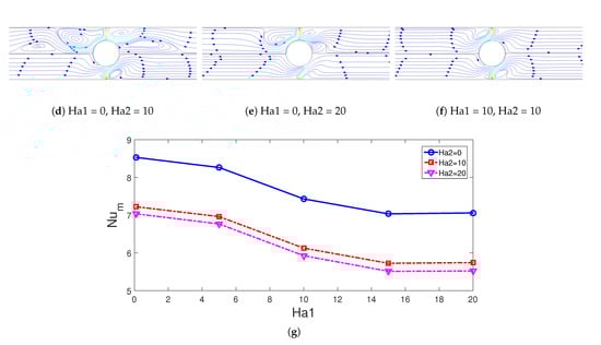 Impacts of MaF strength of the domains (Ha1, Ha2) on the distribution of streamlines (a–f) and average Nu variations (g) (Re1 = Re2 = 200, Rew = 100, H = 8 w, r = 4 w).