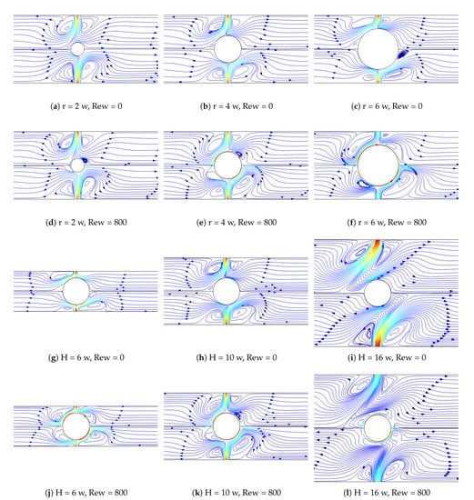 Effects of the hot cylinder size on the streamline distributions for the cases without (a–c) and with (d–f) rotational surface (Re1 = Re2 = 300, Ha1 = 10, Ha2 = 7.5, H = 8 w); impacts of distance from the jets to interface boundary on the streamline variations in the absence (g–i) and presence (j–l) of rotations (Re1 = Re2 = 300, Ha1 = 10, Ha2 = 7.5, r = 4 w).