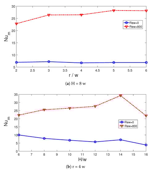 The size of the cylinder and distance between the opposite jets were expected to be influential on the convective heat transfer performance. The flow pattern variations for different sizes (H = 8 w) and different jet spacing (r = 4 w) are shown in Figure 6a–f and Figure 6g–l. For larger cylinder sizes, the distance between the inlet port and impinging surface was reduced; and the vortex size near the inlet regions was affected when rotational surface effects were considered. However, the effects on the flow patterns variations became significant at the largest cylinder size. The distance effects between the opposite jets on the flow patterns are shown in Figure 6 without rotations (g–i) and with rotational surface effects (j–l). At the highest distance, the recirculation regions near the inlet extended toward the cylinder while vortex size was increased. When rotations were considered, small vortices near the hot cylinder surface were established, while the impinging effects became weaker. For the flow dynamics and heat transfer, the size of the cylinder became influential when rotational surface effects were considered. The increment in the average Nu was 23.5% when varying the size from r = 2 w to r = 6 w at the highest rotational speed, and this value was only 1.5% without rotational effects (Figure 7a). The trends in the average Nu while varying the opposite jet distances were different up to H = 14 w, whether the rotations were active or not. As the rotations were present, the average Nu rose up to H = 14 w and then decreased from H = 14 w to H = 16 w (Figure 7b). This is attributed to the weakening of the impinging jet effects at the highest distance where flow field at the inlet zones was directed away from the hot surface of the cylinder. The optimum value of the distance between the jets was attained at H = 14 w, where the average Nu value achieved its highest value for the case with a rotating cylinder—the highest cylinder. In this case, the increment in the average Nu was obtained as 54.5% when jet spacing at the smallest value was compared. There was a 30% reduction in the average Nu when cases at H = 6 w and H = 14 w were compared in the absence of rotational surface effects.