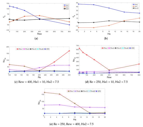 where the first term of the integral is the cross-correlation tensor, and denotes the eigenvalues. Singular value decomposition may also be used to get the modes. The largest energy content was captured with the first mode, and it is distributed in a hierarchical manner. Mode coefficients can be obtained after the projection of the dataset onto modes due to the orthogonality features of the modes. The number of spatial points in the dataset is 1032. Parametric variations of Nu with different Re (eight values), Rew (eight values) and Ha (eight values) were considered. The number of snapshots was 8 × 8 × 8 = 512. The cumulative contribution (CC) of the modes was considered to determine the number of modes retained in the modal representation. For one, three and ten modes, the CC values were 0.681, 0.860 and 0.974, respectively. In the present work, a twenty mode approximation was considered where the CC value was 0.995. The modal coefficients are dependent upon the Re, Rew and Ha. The variations of several mode coefficients with varying Rew and Ha are presented in Figure 8a,b. The modal coefficients are sensitive to the variations in Rew and Ha. The reconstruction of the average Nu which denotes the cooling performance was achieved by superposing all of the modal coefficients multiplied by the corresponding modes. The modes were functions of spatial coordinates which were obtained with SVD. For any parameter of interest within the interval of Re, Rew and Ha, interpolation among the modal coefficients could be utilized to determine the cooling performance at the specified parameter. Polynomials, splines and neural network-based approximations for the modal coefficients can be considered. Variations in the average Nu from the R-C with different numbers of modes are presented in Figure 8c–e. Table 2 presents the comparison results for the average Nu variations with different parametric combinations of (Re, Ha, Rew) considering different numbers of modes. A 20-mode approximation of the Nu gave satisfactory results and captured the variations in Re, Rew and Ha as compared to CFD.