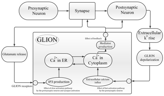 Astrocytes are important components of the neurobiological communication system, and they have the ability to modulate neuronal activity. Glutamate is released into the synaptic gap when neurons fire, and it is partially attached to the astrocytes’ metabotrobic glutamate receptors (mGluR). G-protein-coupled glutamate receptors, which regulate a number of intercellular signaling pathways, are known as metabotrobic glutamate receptors. Group-I glutamate receptors are a subtype of metabotrobic glutamate receptors that are linked to polyphosphoinositol hydrolysis. Inositol 1,4,5-triphosphate (IP3), a type of polyphosphoinoside, which works as a second messenger and modulates calcium signaling, is a critical participant in the release of calcium from internal storage. When glutamate binds to the astrocyte, IP3 is released into the astrocyte’s intracellular space. Ca is released from the ER into the cytosol after IP3 interacts with the IP3 receptor in the endoplasmic reticulum (ER). On the other hand, the level of inositol 1,4,5-triphosphate is controlled by external signals that reach the cell. The release of glutamate from the astrocyte is triggered by an increase in intracellular calcium levels in astrocytes, which is augmented by extracellular glutamate, modifying the pre-synaptic and post-synaptic depolarizing currents in neurons. Furthermore, nonlinear amplitude and frequency modulation events represent inositol 1,4,5-triphosphate dynamics, whereas calcium oscillations are fundamentally frequency-modulated [91]. To describe the architecture of the mathematical modeling, which is explained in the next parts, Figure 1 depicts all important pathways of the system. In this case, several important mediators are considered to cause increases in the intercellular [], triggering the removal of potassium by glions, etc. In this structure, two activation pathways for the glia can be evaluated: fast and slow mechanisms. The fast process is shown by the glion depolarization in case of rise of the extracellular potassium concentration. Furthermore, the slow process is considered by the IP3 production initiated by synapse mediator diffusion. Moreover, a different pathway is applied for the glial response both to the pre-synaptic neuron (its synaptic terminal) and to the post-synaptic neuron [77,82,92,93].