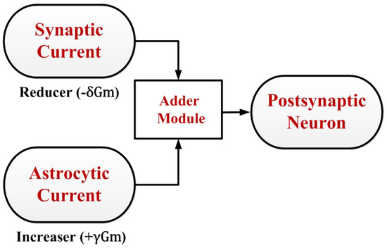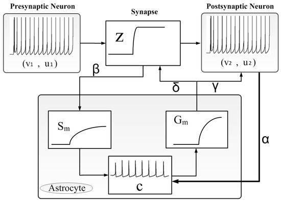 In the CNS, the tripartite synapse [77,82] explains how two coupling neurons are connected to each other in a general formation. As depicted in Figure 2, the astrocyte module produces two main mediators: the secondary mediator () and the glia mediator (). Moreover, calcium dynamics in the astrocyte is represented by c. Mathematical modeling is given by