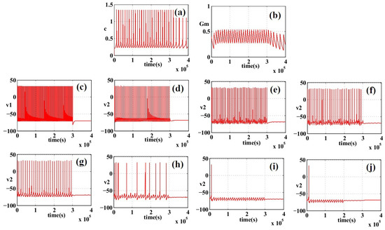 As mentioned, the CNS is made of some basic building blocks: neurons, synapses, and astrocytes. Neurons, as a primary blocks in this biological network, can receive, process, and transmit data to other parts of system. In this context, synaptic coupling between two coupled neurons (pre-synaptic and post-synaptic neurons) can occur if the pre-synaptic neurons can trigger the synaptic gap by appropriate signaling. When this transmission is complete, post-synaptic neuron also starts to undergo spiking activity, with a rate proportional to its synaptic excitation, which is provided by the synaptic cleft. Indeed, after triggering the synapse by the pre-synaptic neurons, it makes an increase or decrease in the level of stimulus current for the post-synaptic neurons [88,98]. In this case event, the astrocyte module can act as a controller for regulating the neurons’ activity. On the other hand, the astrocyte can control the applied stimulation current that is injected into the post-neuron. If the synaptic current to the post-neuron starts to increase strongly, by th proper selection of the astrocyte parameters, the additional spike trains will be removed and some problems such as epilepsy can be controlled [77,82,88,99,100]. Consequently, by proper selection of the astrocyte parameters such as , , , and , the neuronal activity can be modulated and the biological system will be controlled.