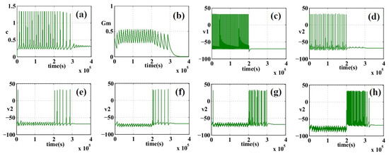 Also, as depicted in Figure 7, simulation results for this case based on different values of are presented. When , pre- and post-neuronal cells are simultaneously found in the spiking activity. By increasing , we can see that the post-synaptic neuron activity at some point in time is independent of the pre-synaptic neuron activity. Thus, if the feedback coefficient of the astrocyte increases strongly, the spiking frequency will also be increased.